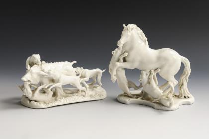 1x Modell-Nr. 124: vier einen Eber hetzende Jagdhunde (H 10,5 cm). / 1x Modell-Nr. 418: Pferd, von zwei Panthern angefallen (H 16,5 cm)