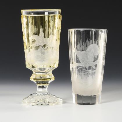 1x Pokal aus farblosem Glas mit zartgelbem Überfang, konischer, facettierter Kuppa, facettiertem Balusterschaft und polygonalem Fuß. Umlaufend die geschnittene Darstellung einer Waldlandschaft mit berittenem Jäger, Jagdhund und Hirsch (H 18 cm). / 1x signiert "J. Urban fec." (= wohl Josef Urban [1872-1933], Mitarbeiter der Künstlervereinigung Wiener Werkstätte): konischer, facettierter Becher aus farblosem Glas mit der tiefgeschnittenen Darstellung einer Waldlandschaft mit Auerhahn (H 14,5 cm)