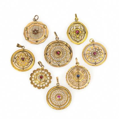 Lange, gefüllte Abhängungen mit feiner Granalien- und Goldstegzier an ergänzter Klipp-Brisur