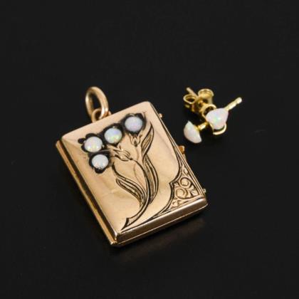 3 Knotenköpfe mit kleinem Farbstein sowie Brillant. Zuchtperle mit kleinem Brillant, Perlmuttteil, 3 zargengefasste Opalcabochons und Markasiten, reliefiertes Ornament mit hellem Stein. An langen Nadeln. 1 Metallschieber