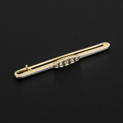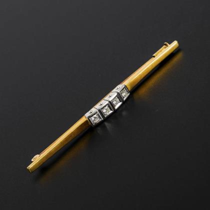 Stabnadel mit 4 kleinen, eingelassenen Altschliffsteinen. Hakenverschluss mit Kippsicherung