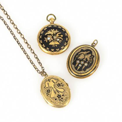 Collier mit großem, reliefiertem Schauteil, Abhängungen, mit Türkiscabochons und Perlchen besetzt, zwischen reliefierter Gliederkette. Kastenschloss mit Sicherheitskette. Passender ovaler, schauseitig reliefierter Klappreif mit Türkis- und Perlchenbesatz. Kastenschloss mit Sicherheitskette. Abhängungen fehlen. Alle Gliederrückseiten verbödet