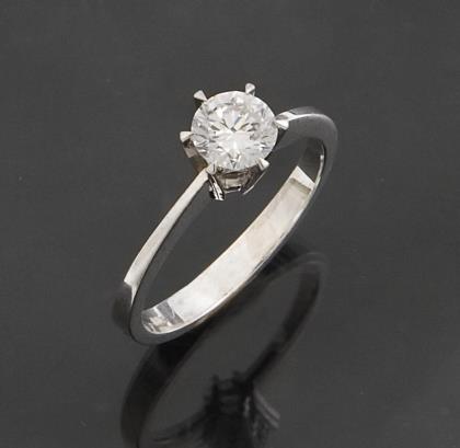 Brillant 0,79 ct in Krappenfassung. Farbe: feines Weiß, Schliff: gut. Stabile volle Schiene. Punzen: Feingehalt, Brillant-Karat eingraviert