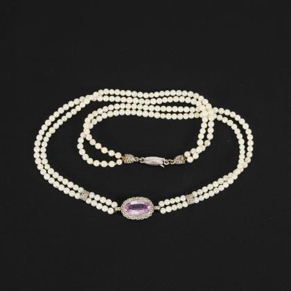 Millegriffes-Schauteil mit zargengefasstem Farbstein (rosafarbener Saphir?), kleinen Diamantrosen und Montierungen, zwischen 2-reihigen Schnürketten mit kleinen Zuchtperlen, an Silberschließe