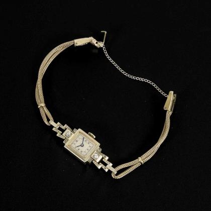 Stiltypische Uhr, besetzt mit 2 Brillanten und kleinen Diamantrosen, Federkrone, arabische Zahlen. Ergänztes Metall-Armband mit Klippverschluss und Sicherheitskette. Werk läuft