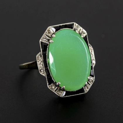 Art-déco-Ring mit Chrysopras, Onyx und Diamantrosen.