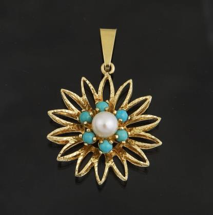 6 kleine Türkise, 1 kleine Zuchtperle, durchbrochen gearbeitete Blütenform. Punzen: Feingehalt, Juweliermarke FB