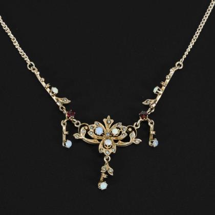 Stiltypischer Anhänger mit zargengefassten Altschliffsteinen. An ergänzter Venezianerkette mit Ringfederschließe