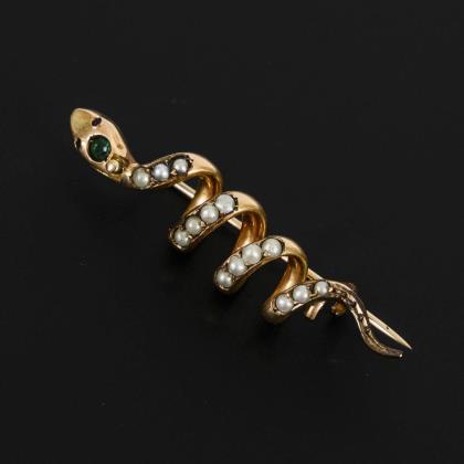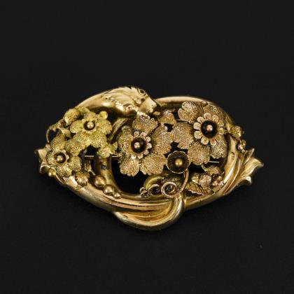 Rahmenbrosche in Schlangenform mit floraler Montierung. Hakenverschluss, Abhängehaken