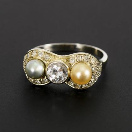 Art-déco-Ring mit Altschliff-Brillant, Zuchtperlen und Diamanten.