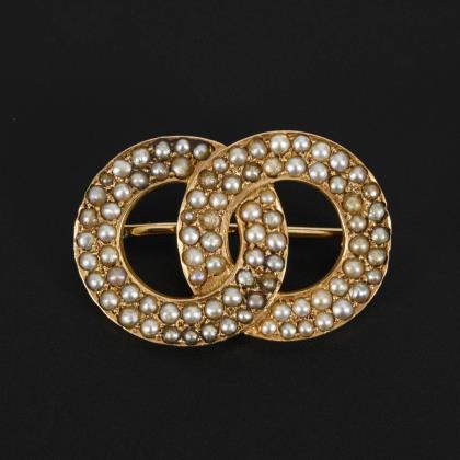 Doppelringbrosche mit eingelassenen Saatperlen. Hakenverschluss