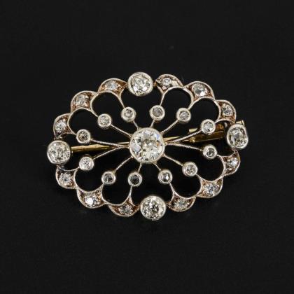 Großer, plastisch gestalteter Blütenzweig mit 2 chatongefassten Altschliff-Brillanten und ca. 144 eingelassenen Diamantrosen. Ergänzter Kugelhaken