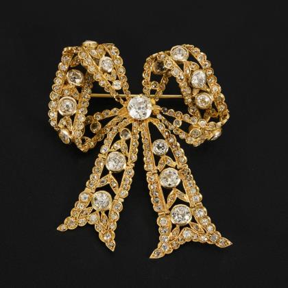 Aufwendig plastisch gearbeitete Brosche mit krappengefasstem Mittelstein, 21 zargengefassten und ca. 215 eingelassenen Altschliff-Steinen. Beide Schleifenbänder durch Scharniere leicht beweglich. Kugelhaken
