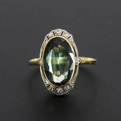 Art-déco-Ring mit Farbstein und Diamantrosen.