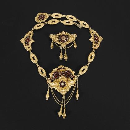 Großes Biedermeiercollier und Brosche mit Granaten.