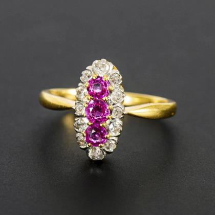 3 Rubine, umgeben von 12 kleinen, chatongefassten Altschliff-Diamanten, zwischen schmaler Schiene