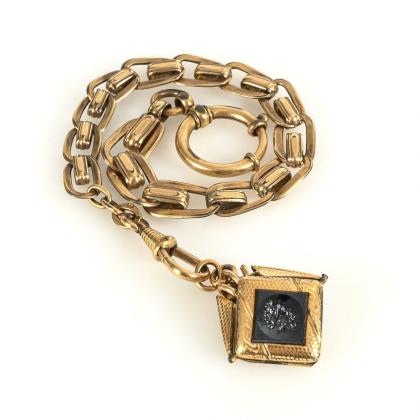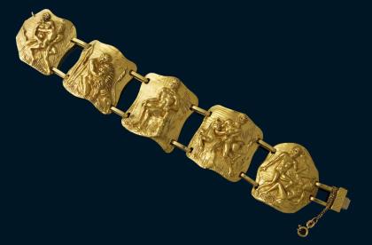 Massiv gearbeitet, fünf Glieder mit reliefierten Darstellungen von Herakles, Kastenschließe, Kettchen mit Federring. Punzen: Feingehalt, Juweliermarke Balestra