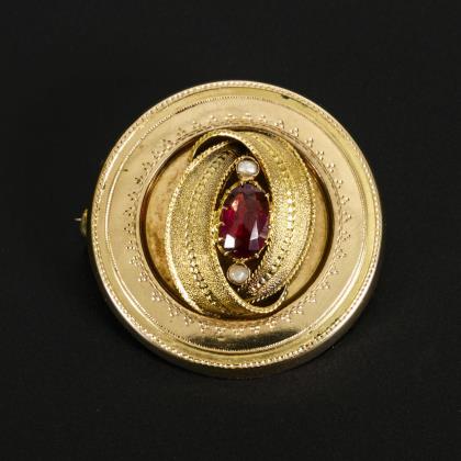 Historische Brosche mit einem navetteförmigen Granat und 2 Saatperlen in einem auf die runde Grundform aufgesetzten Knoten; rückseitig eine Anhängeröse sowie eine Nadel mit Kugelhakenverschluss