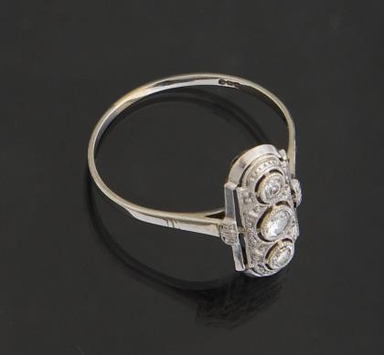 Grazile Form mit 3 kleinen Diamanten in Zargenfassung, schmale Schiene, Punzen: Feingehalt