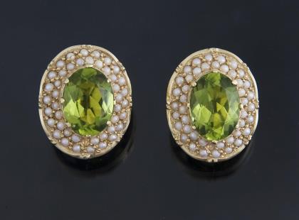 Zwei ovale facettierte Peridote in Krappenfassung, umlaufend in zwei Reihen versetzt angeordnet zahlreiche Saatperlchen, Punzen: Feingehalt