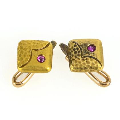 2 kleine, teilreliefierte Knöpfe mit rotem Farbstein am Kippknebel, in grünem Etui "Aug. Beckord Juwelier HERFORD Beckerstr. 15"