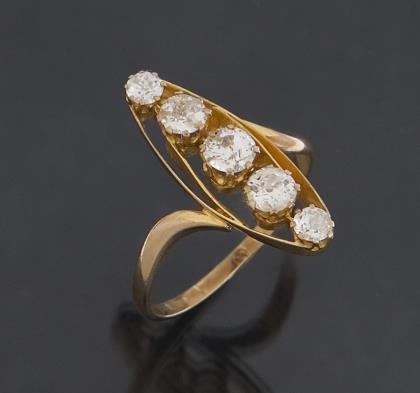 5 Diamanten, circa 0,85 ct, teils mit deutlichen Einschlüssen, in Krappenfassungen, durchbrochen gearbeitet, stabile Schiene. Punzen: Feingehalt