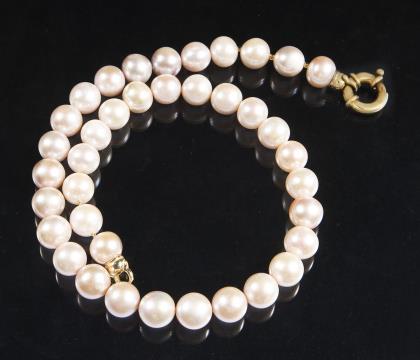 38 roséfarbene Süßwasser-Zuchtperlen mit gutem Lüster circa 10-11 mm. Schließe mit großem Federring, Punzen: Feingehalt