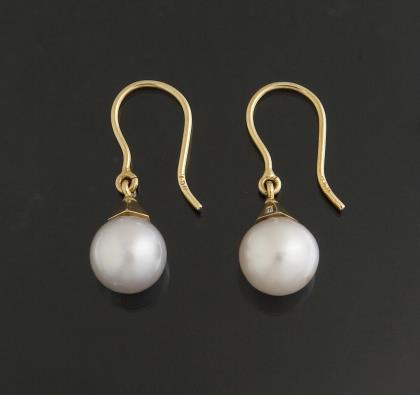 6 kleine Brillanten 0,25 ct H-if (wesselton, lupenrein) in Krappenfassungen, 2 runde Südsee-Zuchtperlen mit gutem Lüster circa 10 mm. Punzen: Feingehalt, italienische Juweliermarke