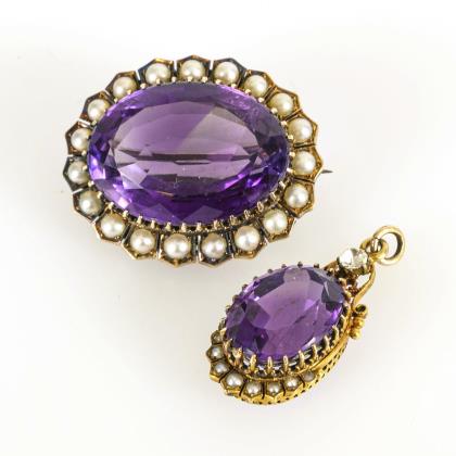 Brosche und Anhänger mit Amethysten und Perlchen.