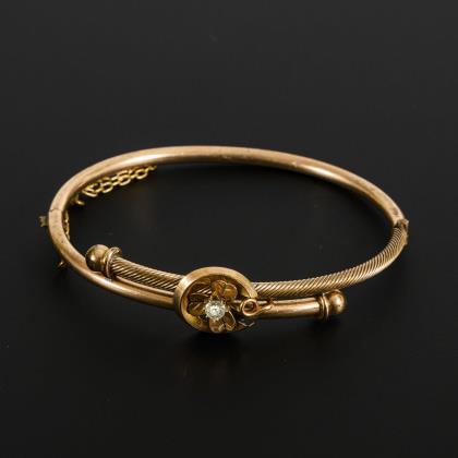 Armreif aus der Zeit um 1900, mit halbmondförmigem Zierelement, darauf aufgesetzt ein dreiblättriges Kleeblatt mit chatongefasstem hellen Schmuckstein; der Verschluss mit Sicherungskettchen