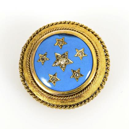 Historische Brosche mit einem großen sowie 5 kleinen mit Diamantrosen besetzten, in türkisfarbenes Emaille eingelassenen Sternen