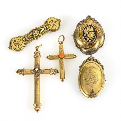 5 historische Schmuckstücke, 3 Broschen und 2 Kreuzanhänger mit Saatperle bzw. Korallencabochon besetzt, sowie eine stilistisch ähnliche, jüngere Brosche als Ergänzung. Broschen mit einfachen Haken- und Kugelhakenverschlüssen
