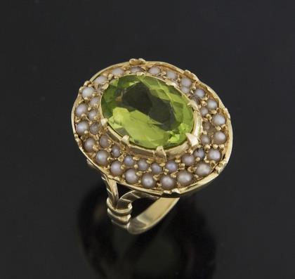 Ovaler facettierter Peridot in Krappenfassung 11 x 9 mm, umlaufend in zwei Reihen versetzt angeordnet zahlreiche Saatperlchen, stabile Schiene, Punzen: Feingehalt, undeutliche Juweliermarke