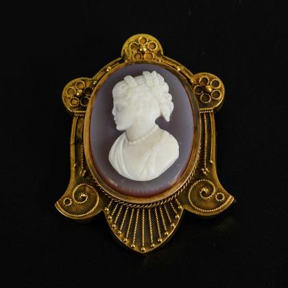 Achatkamee einer Dame in antikisierender Gewandung im Profil, in granuliert ausgestalteter Gelbgoldfassung