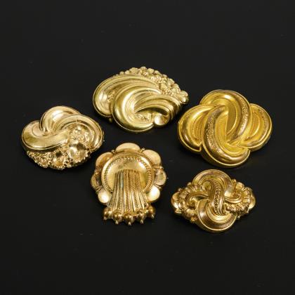 Konvolut aus 5 hohl gearbeiteten Biedermeierbroschen mit einfachen Hakenverschlüssen