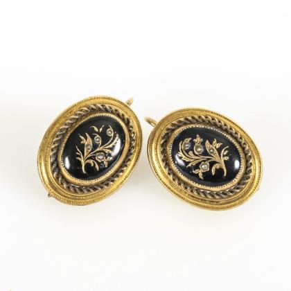 Historisches Ohrhängerpaar aus Schaumgold mit schwarzem Emaille und Blütendécor mit kleinen Saatperlchen