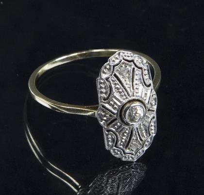 Grazile Form, kleiner Diamant in Zargenfassung, seitlich 2 Diamantsplitter, schmale Schiene, Punzen: Feingehalt