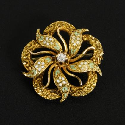 Historische Brosche mit Emaille und Diamantrosen.