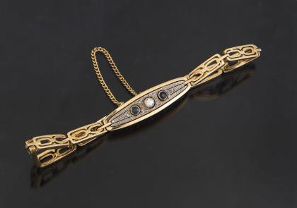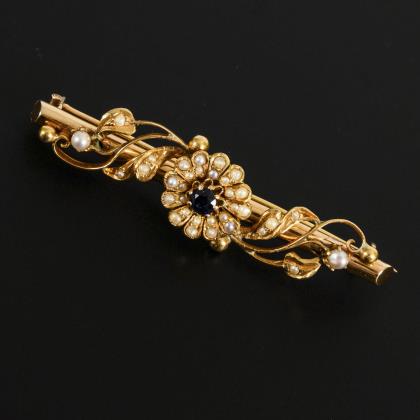 Jugendstilbrosche mit Saphir und Saatperlen.