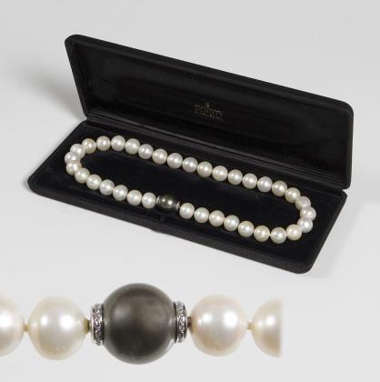 Charivari mit 46 Tahiti-Zuchtperlen und Südsee-Zuchtperlen in Barock-Form, Karabiner-Schließe, Punzen: Feingehalt