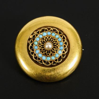 Historische Brosche. Hohl gearbeitet, mit 18 kleinen Türkiscabochons und einer halbierten Saatperle. Die Nadel mit einfachem Hakenverschluss