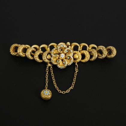 Historisches Armband mit zarter Emaille-Malerei, Altschliff-Brillanten und Sicherheitskettchen mit kleiner Abhängung. Dazu passende Brosche siehe Kat.-Nr. 48