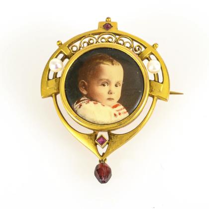 Stiltypische Brosche mit zargengefasstem Kinderfoto, 2 kleinen Zuchtperlen und ergänzter Granatabhängung