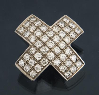 45 Brillanten zusammen 1,52 ct wesselton-pique, rückseitig zwei Ösen, als Kreuz mit vier gleich langen Seiten oder als X-Form tragbar. Ohne Punzen, Feingehalt mit Säure geprüft