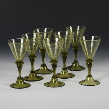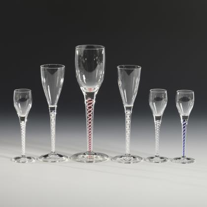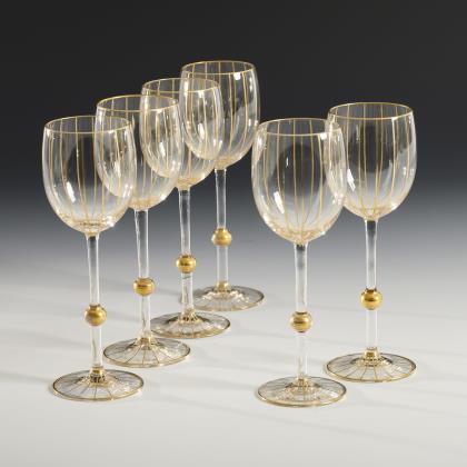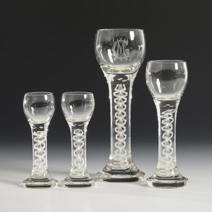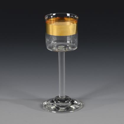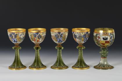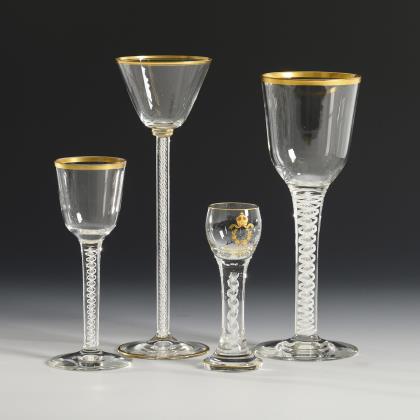 3 Kelchgläser aus farblosem Glas mit weißem Spiralfaden im hohen Stängel, Rundfuß, Goldrand (H 19, 26,5 und 28 cm). / 1 Likörglas mit weißem Spiralfaden und der schauseitigen Reliefgold- und Emailmalerei eines Lorbeerkranzes mit gekreuzten Schwertern unter der Kaiserkrone und der Bezeichnung "Kriegsjahr 1914/15"; unterseitig Goldmarke der Josephinenhütte (H 15,5 cm)