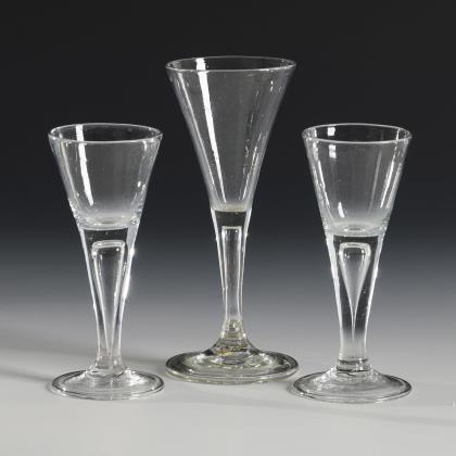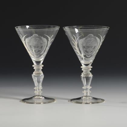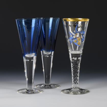 2 Spitzkelche aus farblosem Glas mit kobaltblauem Innenfang, eingestochenen Luftblasen, massivem, konischem Schaft und Rundfuß. / 1 Spitzkelch aus farblosem Glas mit einem schauseitigen, emailgemalten Wappen, eingestochenen Luftblasen, wabenfacettiertem Schaft, Rundfuß, unterseitig signiert "Gebr. Goedecke Hannover"