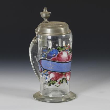 Walzenkrug mit ausgestelltem Stand, Bandhenkel und zinnmontiertem Scharnierdeckel. Schauseitig die Darstellung eines Blumenbuketts mit blauem Band, darauf die Bezeichung "Göttlichen Segen, glückliche Zeiten, wünsche ich euch Beiden."; Abriss