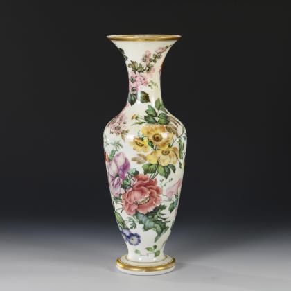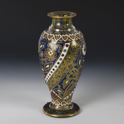 Balustervase mit aufgelegten Glascabochons und bunter Floral- und Ornamentalmalerei