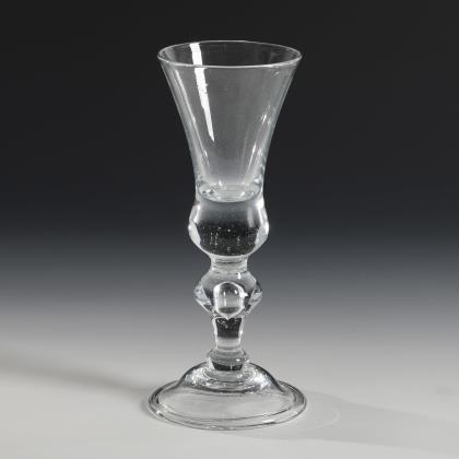 Glockenkuppa mit massivem Ansatz, Balusterschaft mit eingestochener Luftblase, hutartiger Fuß mit umgeschlagenem Rand; Abriss