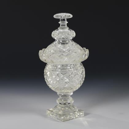 Zylindrische Kuppa, Knaufdeckel, zylindrischer, nach unten offener Schaft, ansteigender Fuß. Dreifach rapportierendes Liniendekor in Gold, Schwarzlot und mattgeätzten Bändern, schauseitig ein Medaillon mit Volutenfond und einem springenden Hirsch